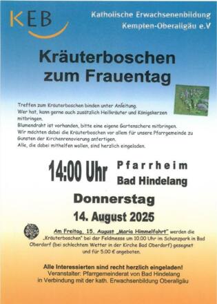 Am Freitag, 15. August "Maria Himmelfahrt" werden die "Kräuterboschen" bei der Feldmesse um 10.00 Uhr im Schanzpark in Bad Oberdorf (bei schlechtem Wetter in der Kirche Bad Oberdorf) gesegnet und für 5,00 € angeboten.