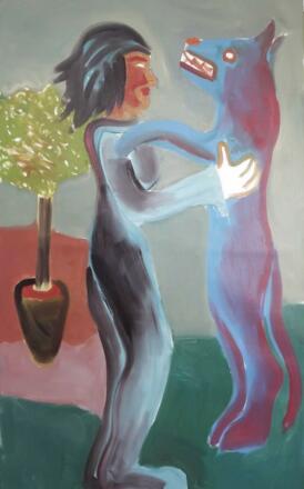 Stefan Glas malt in kräftigen, gebrochenen Farben auf großen Leinwände und gestaltet Tiere und Menschen, einzeln und in Kombination. Seine Darstellungen sind stilisiert und schemenhaft und gehen wenig ins Detail. Im Zentrum stehen die Figuren, der Hintergrund ist meist nur angedeutet. Gerade wegen dieser Reduktion sind seine Werke voll Emotion und Ausdruckskraft.