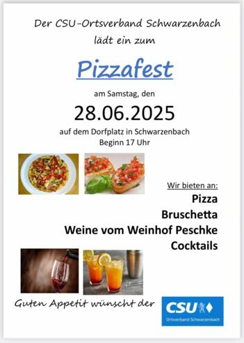 Der CSU-Ortsverband Schwarzenbach lädt ein zum PizzafestWann & Wo: 28.06.2025 ab 17 Uhr auf dem Dorfplatz in SchwarzenbachWir bieten an: