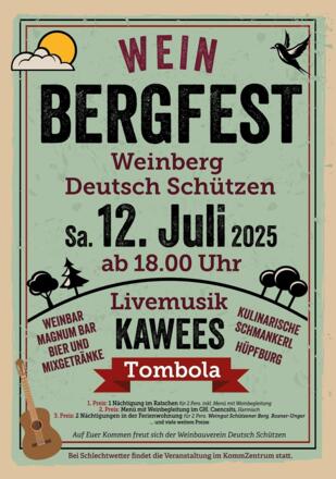Das Bergfest am Weinberg bietet Livemusik mit Kawees, eine Weinbar, eine Magnum Bar, Bier und Mixgetränke, eine Tombola, kulinarische Schmankerl und eine Hüpfburg für Kinder. Bei Schlechtwetter findet die Veranstaltung im KommZentrum statt.