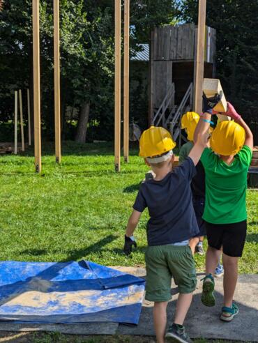 In dieser Woche dreht sich alles um das Thema Bauen. Gemeinsam werden wir viele kleine und große Bauwerke zusammenzimmern. Von kleinen Basteleien bis hin zum großen Haus ist alles dabei. Mit Hammer, Nagel und Säge errichten wir neue Hütten für die Hüttenstadt und bringen die vorhandenen wieder in Schuss. Wir freuen uns auf eine abwechslungsreiche Woche mit vielen kleinen und großen Baustellen.