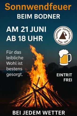 Sonnwendfeuer beim Gasthaus Bodner. Für das leibliche Wohl ist bestens gesorgt. Bei jedem Wetter. Eintritt frei.