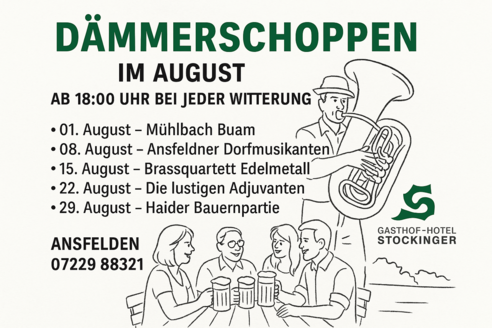 Beste Ansfeldner Tradition sind die Dämmerschoppen im Gastgarten vom Gasthof Stockinger. Dank dem überdachten und klimatisierten Gastgarten findet die Veranstaltung bei jeder Witterung statt.