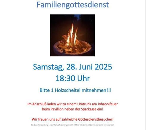 Herzliche Einladung zum Familiengottesdienst in der Pfarrkirche St. Nikolaus in Marktschellenberg! Im Anschluß findet ein Johannisfeuer auf dem Marktplatz statt.Es gibt Bowle und kühle Getränke und für die Kinder Stockbrot.