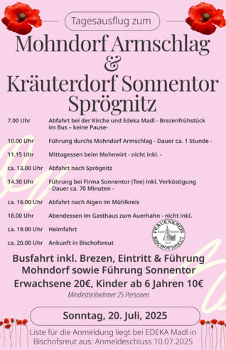 Tagesausflug Mohndorf Armschlag & Kräuterdorf Sonnentor Sprögnitz.Busfahrt inkl. Brezen, Eintritt & Führung Mohndorf sowie Führung Sonnentor Erwachsene 20€ und Kinder ab 6 Jahren 10€.Mindestteilnehmer 25 Personen.Liste für die Anmeldung liegt bei Edeka Madl in Bischofsreut aus: Anmeldeschluss 10.07.2025.