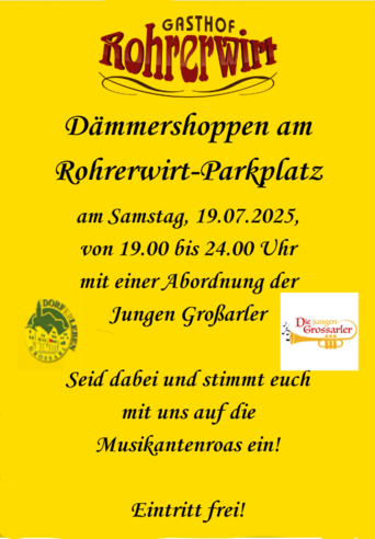 Der Gasthof Rohrerwirt lädt herzlich zum Dämmershoppen als Einstimmung auf die Musikantenroas ein. Eine Abordnung der Musikgruppe "Jungen Großarler" sorgt für musikalische Unterhaltung und gute Stimmung. Eintritt frei.