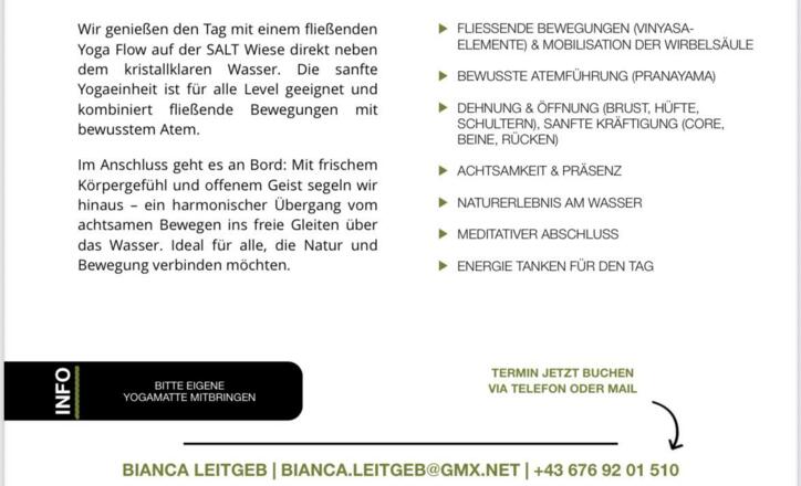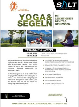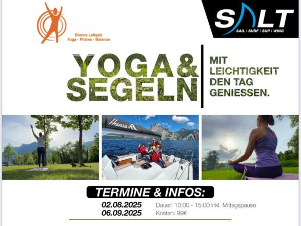 Gemeinsames Yoga unmittelbar am Ufer des Traunsees mit anschließendem Segeln. Dauer 10:00-15:00 Uhr inkl. Mittagspause. Bitte Yogamatte mitnehmen. Anmeldung unter +43 676 9201510 oder bianca.leitgeb@gmx.net erforderlich!