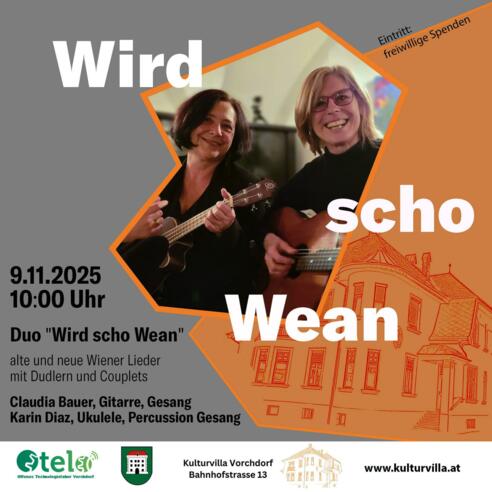 Am 9. November 2025 um 10:00 Uhr lädt das Duo „Wird scho Wean“ zu einem besonderen musikalischen Vormittag ein. Claudia Bauer (Gitarre, Gesang) und Karin Diaz (Ukulele, Percussion, Gesang) präsentieren im Stil traditioneller Wiener Lieder eine fein abgestimmte Mischung aus alten und neuen Melodien, ergänzt durch Dudler und Couplets.