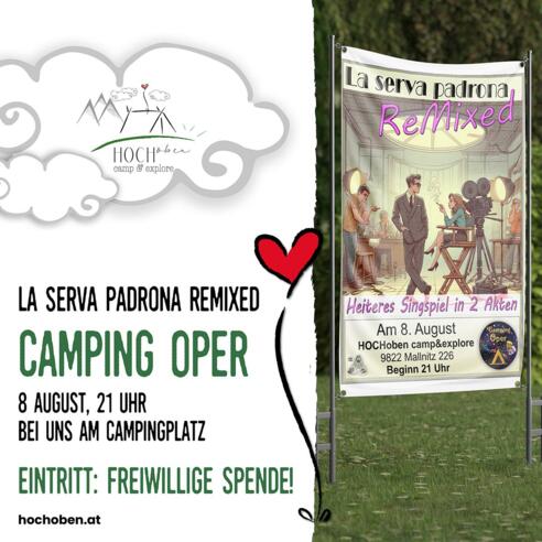 unter den Sternen! Am 8. August um 21:00 Uhr verwandelt sich HOCHoben in eine magische Opernbühne! "La serva padrona ReMixed" - ein Singspiel in 2 Akten Einzigartige Kulisse auf 1.200m Seehöhe Camping meets Culture Eintritt gegen freiwillige Spende. Es wird ein unvergessliches Erlebnis zwischen Bergpanorama und Gesang! Wir freuen uns auf euer Kommen! (Die Veranstaltung entfällt bei Schlechtwetter.)