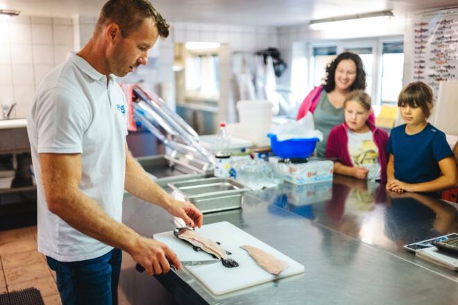 Danach geht es in den Hofladen, wo wir Ihnen unsere Verarbeitung und Zubereitung näher bringen. Natürlich wird auch gezeigt wie man einen Fisch ordentlich filetiert.