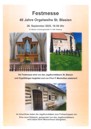 Dank der Initiative vom damaligen Bgm. Rudolf Garstenauer und dem Bad Haller Tierarzt Dr. Friedl Pichler, der die Orgel aus eigenen Mitteln erwarb, begann eine beeindruckende Gemeinschaftsleistung. Die Jagdhornbläser und die Jägerschaft bauten die Orgel ab, transportierten sie mit Traktoren und Lastwagen nach St. Florian zum Orgelbauer Gottfried Seitz und sammelten gemeinsam mit vielen Helferinnen und Helfern die notwendigen Mittel für Restaurierung und Einbau. Unterstützung kam von Privatpersonen, Firmen, Banken, den Gemeinden Adlwang, Bad Hall und Pfarrkirchen sowie vom Land Oberösterreich. Am 22. September 1985 wurde die Orgel schließlich feierlich geweiht – ein Tag, der die kleine Kirche zu St. Blasien wieder mit festlichem Leben erfüllte.