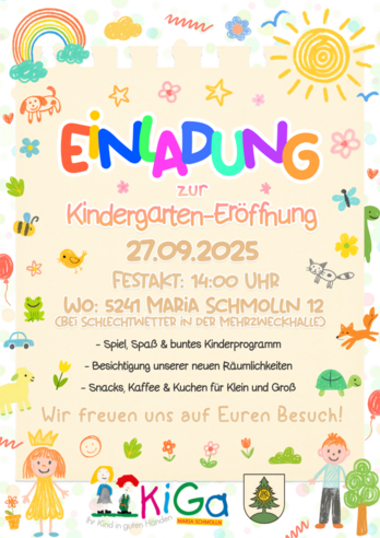 Am 27. September 2025 feiern wir gemeinsam die offizielle Eröffnung unseres Kindergartens und laden euch herzlich dazu ein!