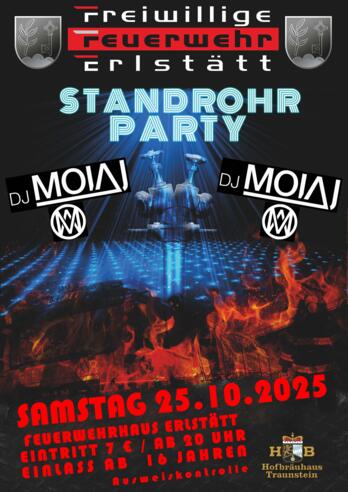 FFW Erlstätt: Standrohrparty am Feuerwehrhaus in Erlstätt Eintritt 7 € / ab 20 Uhr Einlass ab 16 Jahren! DJ Moiaj