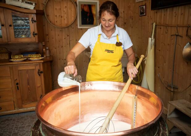 Käse erleben statt nur probieren: Beim Schaukäsen schaut ihr der Alpsennerin über die Schulter und kostet im Anschluss die verschiedenen Sorten des feinen Heumilch-Käses. Ein besonderes Erlebnis, das Handwerk, Wissen und Geschmack verbindet – im Herzen des Kleinwalsertals.