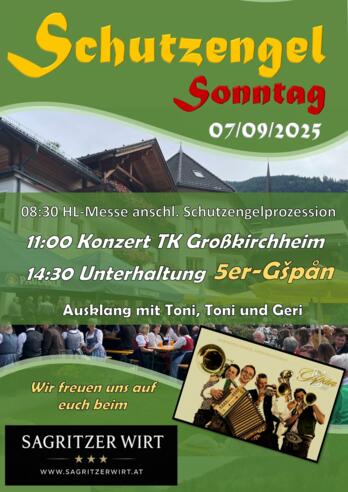 Das Schutzengelfest beginnt um 8:30 Uhr mit der Heiligen Messe und der anschließenden Schutzengelprozession, gefolgt vom Konzert der Trachtenkapelle Großkirchheim um 11:00 Uhr, musikalischer Unterhaltung mit den 5er-Gspan ab 14:30 Uhr sowie einem stimmungsvollen Ausklang mit dem Trio Toni, Toni und Geri.