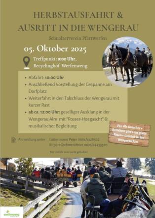 Treffpunkt um 09:00 Uhr beim Recyclinghof Werfenweng und Abfahrt um 10:00 Uhr. Anschließend werden die Gespanne am Dorfplatz vorgestellt, bevor es weiter zum Talschluss in der Wengerau mit kurzer Rast geht. Ab ca. 12:00 Uhr gibt es einen geselligen Ausklang in der Wengerau Alm mit "Rosserer-Hoagascht" und musikalischer Begleitung.