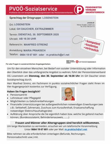 Um für den einzelnen Menschen, bei Bedarf von sozialer Unterstützung oder Information den Überblick über das umfangreiche Angebot zu wahren, führt der Pensionistenverband (OG Losenstein) am Dienstag, dem 30. September ab 16:30 Uhr im GH Daucher einen Sozialsprechtag durch.