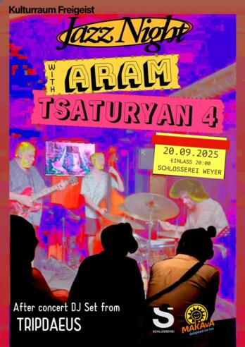 An diesem besonderen Samstag kommt Aram Tsaturyan mit seinem Quartet in die Schlosserei Weyer, bei dem neben David Dolliner und Matheus Jardim auch Nikolaus Holler aka Niklouds die Ehre hat, Arams geniale Originals zu interpretieren und einen ganz speziellen Konzertabend gemeinsam zu gestalten.