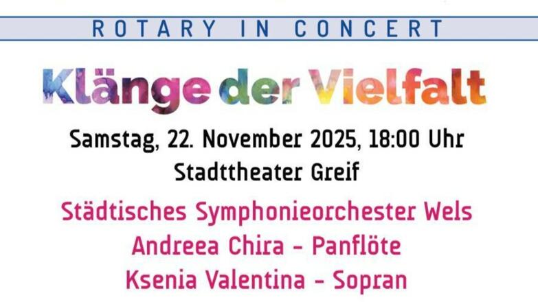 Ein ungewöhnliches Konzert rückt im November 2025 nicht nur Musik, sondern auch Menschlichkeit in den Mittelpunkt: Unter dem Motto „Klänge der Vielfalt“ laden erstmalig alle Welser Rotary Clubs sowie Rotaract unter der Leitung von Rotary Club Wels Nova am 22. November 2025 um 18:00 Uhr ins Stadttheater Greif ein. Der Reinerlös kommt dem inklusiven Ensemble UNIverse der Anton Bruckner Privatuniversität zugute. Mit Volldampf und Feingefühl bringt dieses Abendprogramm musikalische Kontraste zusammen – und verbindet sie sinnstiftend. Das Städtische Symphonieorchester Wels tritt gemeinsam mit Solistinnen aus ganz anderen Klangwelten auf: Andreea Chira präsentiert die Panflöte, Ksenia Valentina den Sopran, dirigiert wird vom Duo Martina Franke & Walter Rescheneder. Der inklusive Teil des Abends stammt vom Ensemble UNIverse unter der Leitung von Petra Linecker & Andreas Huber – mit einer musikalischen Präsentation inklusive der Uraufführung „außen.Vor!“ von Severin Trogbacher.