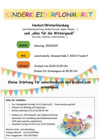 Herbst/Winterbekleidung (auch Babyausstattung, Kindersitze & -wägem, Wiegen,...) und alles für die Wintergaudi (Ski, Bob, Schlittschuhe,...)Kleine Stärkung für zwischendurch und Kuchen zum mitnehmen.