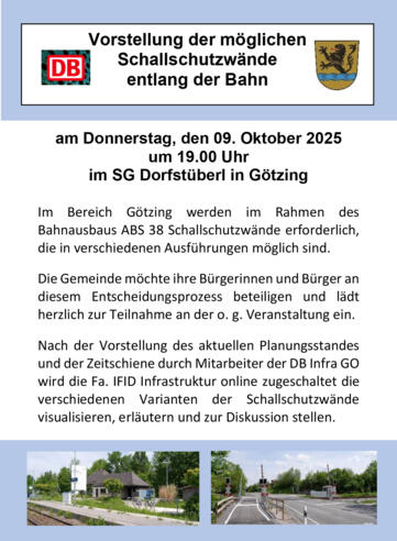 Im Bereich Götzing werden im Rahmen des Bahnausbaus ABS 38 Schallschutzwände erforderlich, die in verschiedenen Ausführungen möglich sind. Nach der Vorstellung des aktuellen Planungsstandes und der Zeitschiene durch Mitarbeiter der DB Infra GO wird die Fa. IFID Infrastruktur online zugeschaltet die verschiedenen Varianten der Schallschutzwände visualisieren, erläutern und zur Diskussion stellen