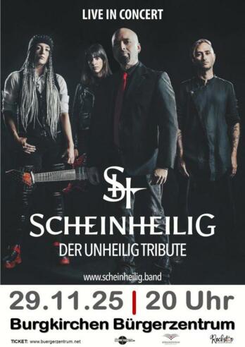 SCHEINHEILIG – der UNHEILIG Tribute "UNHEILIG ist Geschichte…und die Geschichte geht weiter" Großartig waren sie, die UNHEILIG-Songs wie „Geboren um zu Leben“, „Zeit zu Gehen“, „So wie du Warst“ , „Wie wir Waren“ oder „Ich würd dich gern Besuchen“. Unvergessen werden sie und viele weitere für immer blieben. Großartig waren nicht nur die Songs, es war vor allem auch der Graf mit seiner tiefen, warmen und berührenden Stimme und seinen vielschichten und tiefgründenden Texten die einen auf eine Achterbahnfahrt der Gefühle mitnahmen. Fünf junge Menschen, allesamt Profimusiker seit Jahren und Bewunderer des Grafen, seiner Musik und seiner Texte, wollten, dass das was sie live so oft erleben durften auch in Zukunft möglich sein wird. Mit großer Ehrfurcht zum Original und Liebe zum Werk des Grafen und gleichzeitig auch mit der Freiheit, seiner Musik einen eigenen Stempel aufzudrücken gründeten sie SCHEINHEILIG. SCHEINHEILIG spielen als live-Band viele der großen UNHEILIG Songs und auch ein paar seltene Perlen. All‘ die geilen Texte, all‘ die tollen Melodien, dazu gibt’s gratis Gänsehaut, wunderbare Erinnerungen, Wehmut und einfach eine wunderbare Zeit. So wie sie waren: UNHEILIG, so wie er war: der Graf. "UNHEILIG ist Geschichte…und die Geschichte geht weiter". SCHEINHEILIG spielen UNHEILIG. Seit der große Graf die Bühne verlassen hat, sind schon ein paar Jahre ins Land gezogen. Seine Songs leben jedoch ewig und sind heute schon unvergessene Klassiker geworden. Das ist aber nicht genug. Um diesen großartigen Act zu Ehren und zu würdigen, wurde «Scheinheilig – A TRIBUTE TO UNHEILIG» ins Leben gerufen. Eine Band, die sich komplett dem Unheilig Universum verschrieben hat und eben diese Songs noch einmal auf die großen Bühnen zurückbringt.
