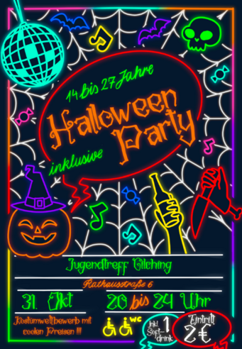 Inklusive Halloween-Party im Jugendtreff Gilching:Ein Abend voller Grusel, Beats und GemeinschaftAm Freitag, den 31.10. verwandelt sich der Jugendtreff Gilching in eine schaurig schöne Partylocation. Unter dem Motto „Halloween - Grusel & Spaß“ sind junge Menschen zwischen 14 und 27 Jahren eingeladen, von 20:00 bis 24:00 Uhr gemeinsam zu tanzen, zu feiern und unvergessliche Momente zu teilen.Das Event setzt ein klares Zeichen für gelebte Inklusion: Alle sind willkommen – unabhängig von Herkunft, Fähigkeiten oder Hintergrund. Die bunte Atmosphäre fördert Begegnung, Austausch und ein starkes Wir-Gefühl. Damit setzt die Gemeinde Gilching ein sichtbares Zeichen für Vielfalt und Zusammenhalt.Der Eintritt kostet lediglich 2 Euro. Dafür erwartet die Besucher:innen nicht nur ein freies Softgetränk, sondern auch ein mitreißender Musikmix , der für ausgelassene Stimmung sorgt. Kreative Highlights wie ein Kostümwettbewerb, Halloween-Deko, temporäre Tattoos und Knicklichter machen den Abend zu einem echten Erlebnis für alle Sinne.Selbstverständlich ist die Veranstaltung barrierefrei gestaltet. Menschen mit Einschränkungen können sich auf einen uneingeschränkten Zugang und ein inklusives Umfeld verlassen.Kommt vorbei, bringt eure Freund:innen mit und feiert mit uns eine unvergessliche Halloween-Nacht !Wir freuen uns auf einen schaurig-schönen Abend voller Lebensfreude und Miteinander.Kontakt:Gemeinde Gilching, Sabine Ayhan, zuständig für Inklusion-Tel: 08105-3866-71- E-Mail: ayhan@gemeinde.gilching.de Jugendtreff Gilching, Rathausstr.6-Tel: 08105-77844545-E-Mail: info@jugendtreff-gilching.de