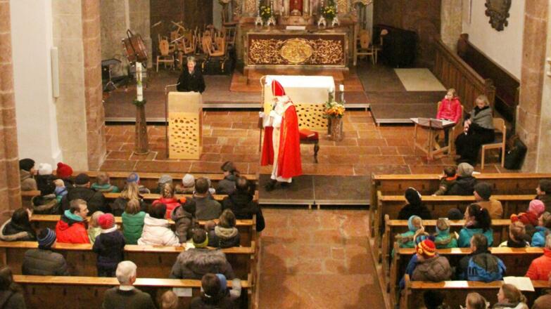 Jedes Kind bekommt einen Schokoladen-Nikolaus vom Nikolaus überreicht.