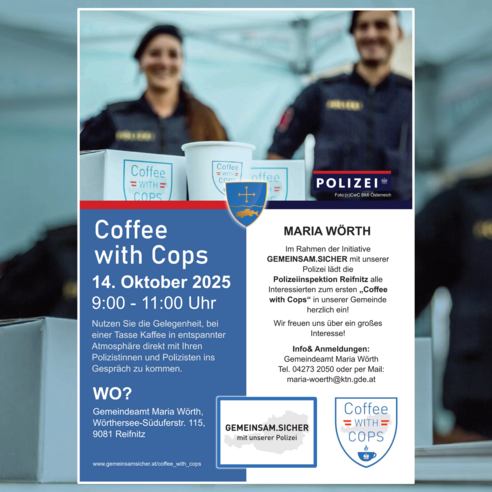 Im Rahmen der Initiative GEMEINSAM.SICHER mit unserer Polizei lädt die Polizeiinspektion Reifnitz alle Interessierten zum ersten „Coffee with Cops“ in unserer Gemeinde herzlich ein! Wir freuen uns über ein großes Interesse!