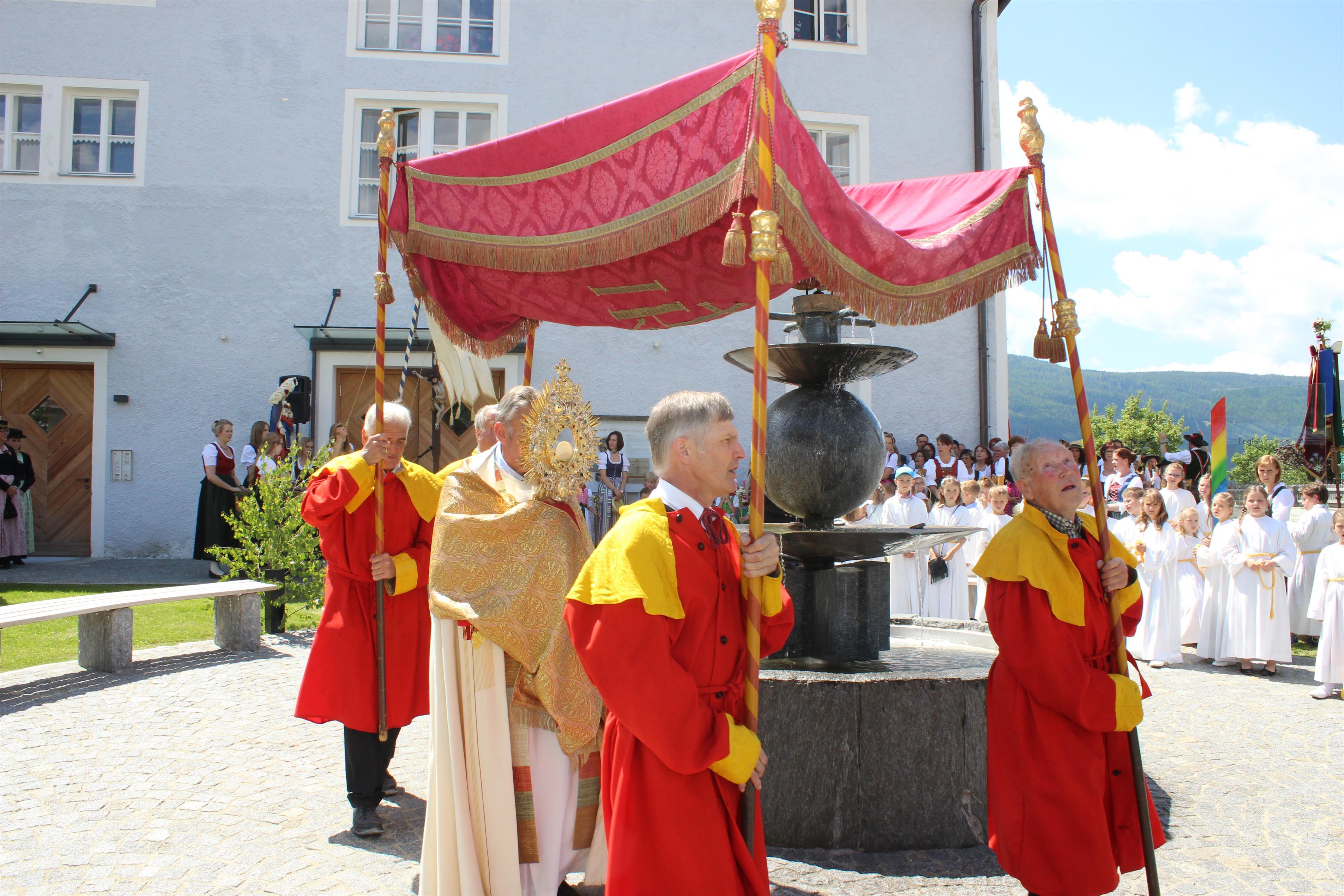 "Fest des heiligsten Leibes Christi". Erinnert wird an die Gegenwart Jesus Christus im geweihten Brot (Hostie) und im Wein. Das Besondere am Fronleichnamsgottesdienst ist eine Prozession, bei der das geweihte Brot in einem wertvollen Gefäß - der Monstranz – durch die Straßen getragen wird.
