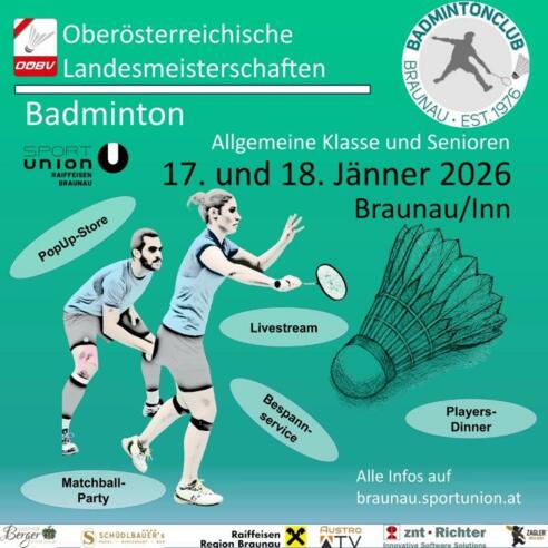 Die Sektion Badminton der Sportunion Raiffeisen Braunau lädt herzlich zur oberösterreichischen Landesmeisterschaft 2026 ein. Im Rahmen des 50-jährigen Bestehens von Badminton in Braunau wird dieses sportliche Highlight am 17. und 18. Januar 2026 in der Bezirkssporthalle Braunau ausgetragen – ein würdiger Anlass, um sportliche Höchstleistungen und gemeinsames Feiern zu verbinden.
