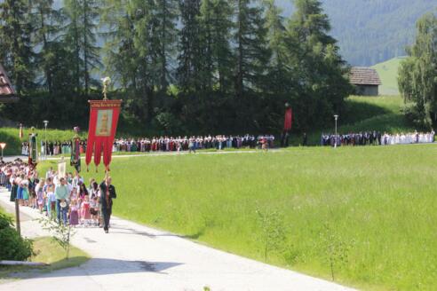 "Fest des heiligsten Leibes Christi". Erinnert wird an die Gegenwart Jesus Christus im geweihten Brot (Hostie) und im Wein. Das Besondere am Fronleichnamsgottesdienst ist eine Prozession, bei der das geweihte Brot in einem wertvollen Gefäß - der Monstranz – durch die Straßen getragen wird.