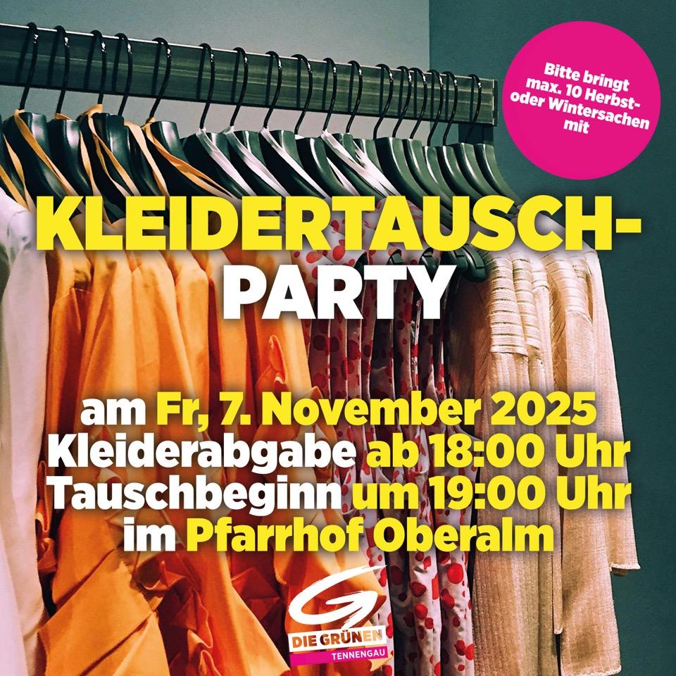 Am 7.11.25 veranstalten die Grünen Tennengau wieder ihre Kleidertauschparty im Pfarrsaal Oberalm. Bitte bringen Sie höchstens 10 schöne und gut erhaltene Herbst- oder Winterkleidungsstücke sowie Accessoires mit und tauschen sie diese.