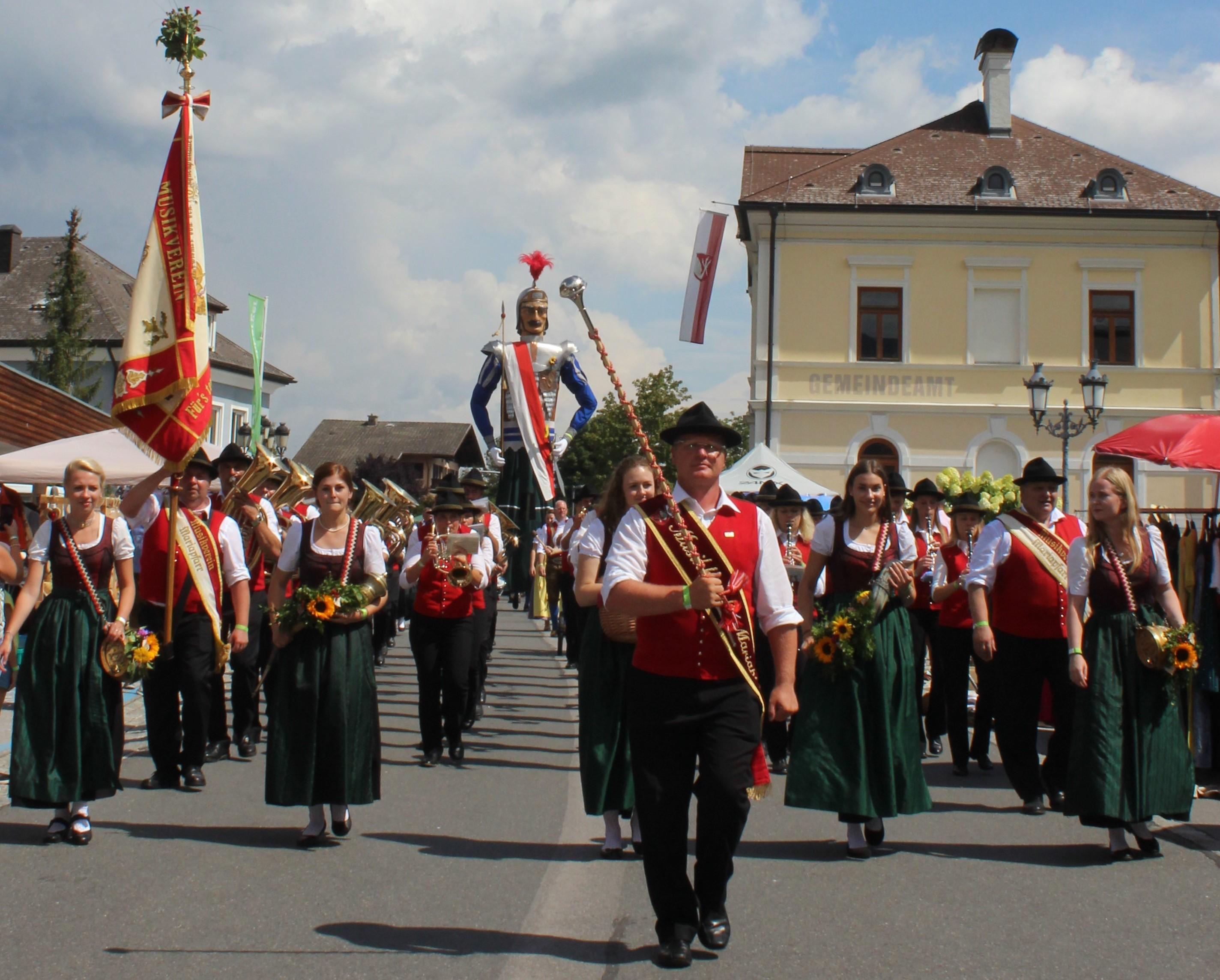 Es ist schon ein imposantes Schauspiel, wenn die mächtige Riesenfigur, der Samson, mit seinen beiden Zwergenbegleitern durch die Gassen getragen wird. Der Samson wird von der Trachtenmusikkapelle Mariapfarr begleitet, zu deren Musik er seine Ehrentänze vorführt. Start ist beim Gemeindeamt.