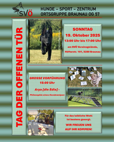 Am 19. Oktober 2025 veranstaltet der SVÖ Braunau, das Hundesportzentrum, einen Tag der offenen Tür.