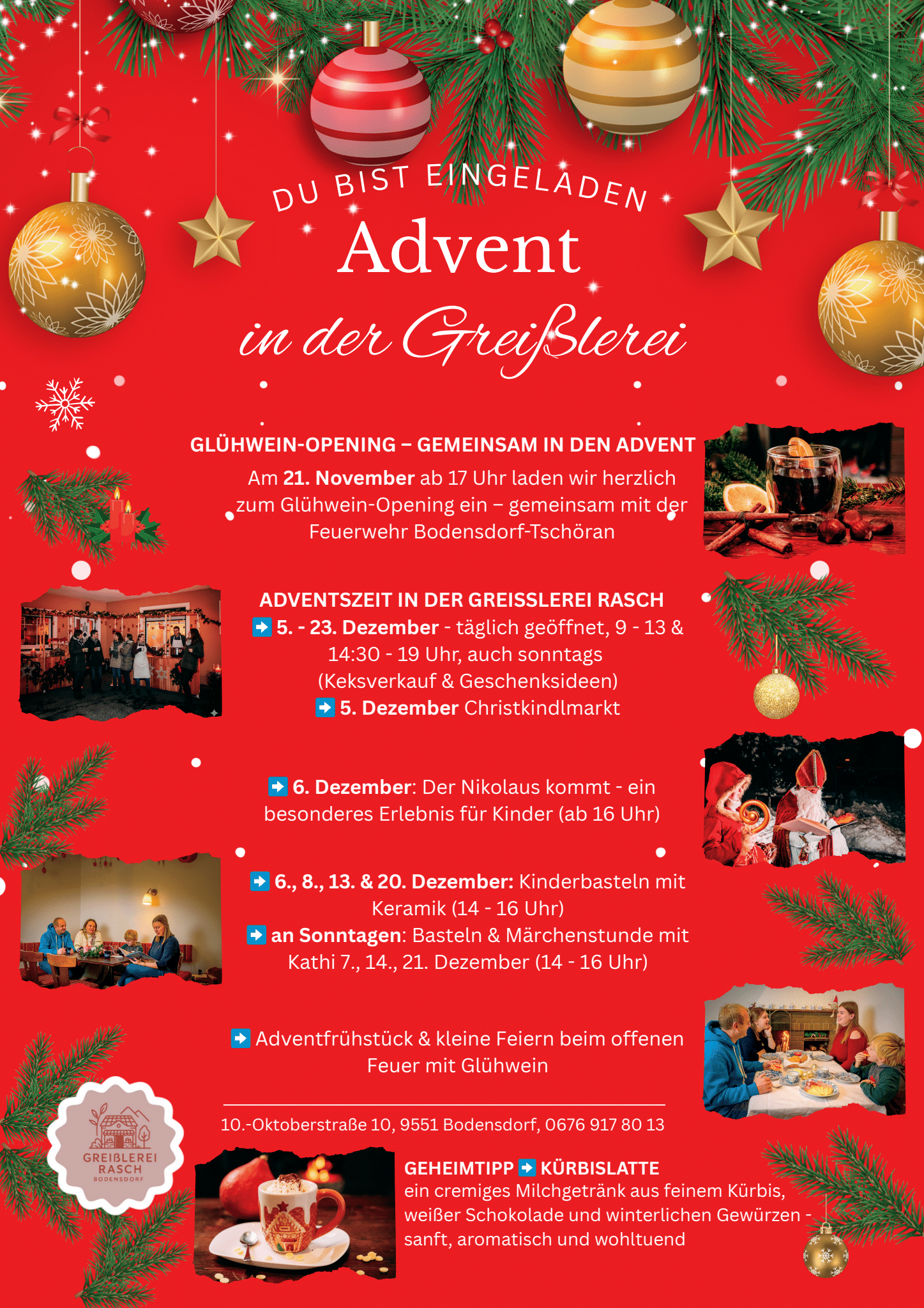 Ein gemütlicher Abend zum Ankommen und Zusammensein – mit Glühwein, Glühmost, Punsch und Bier, Selcher von der Feuerwehr und Schmankerln aus der Greißlerei Rasch.