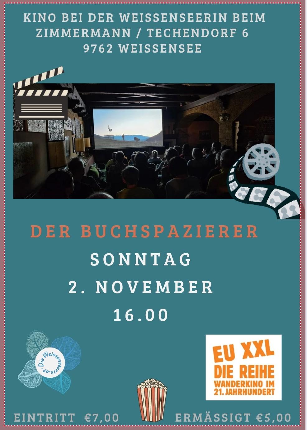 Kino bei der Weissenseerin. „Der Buchsparzierer“. Beginn 16.00 Uhr. Platzreservierung auf www.dieweissenseerin.at , Bezahlung direkt vor Ort von € 5,- bis € 7,-.