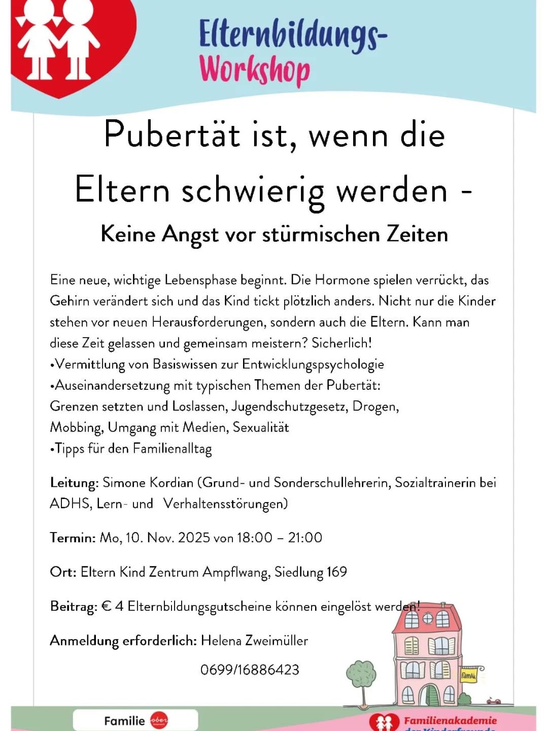 | Preisinformation | Beitrag: € 4,- Elternbildungsgutscheine können eingelöst werden!! |