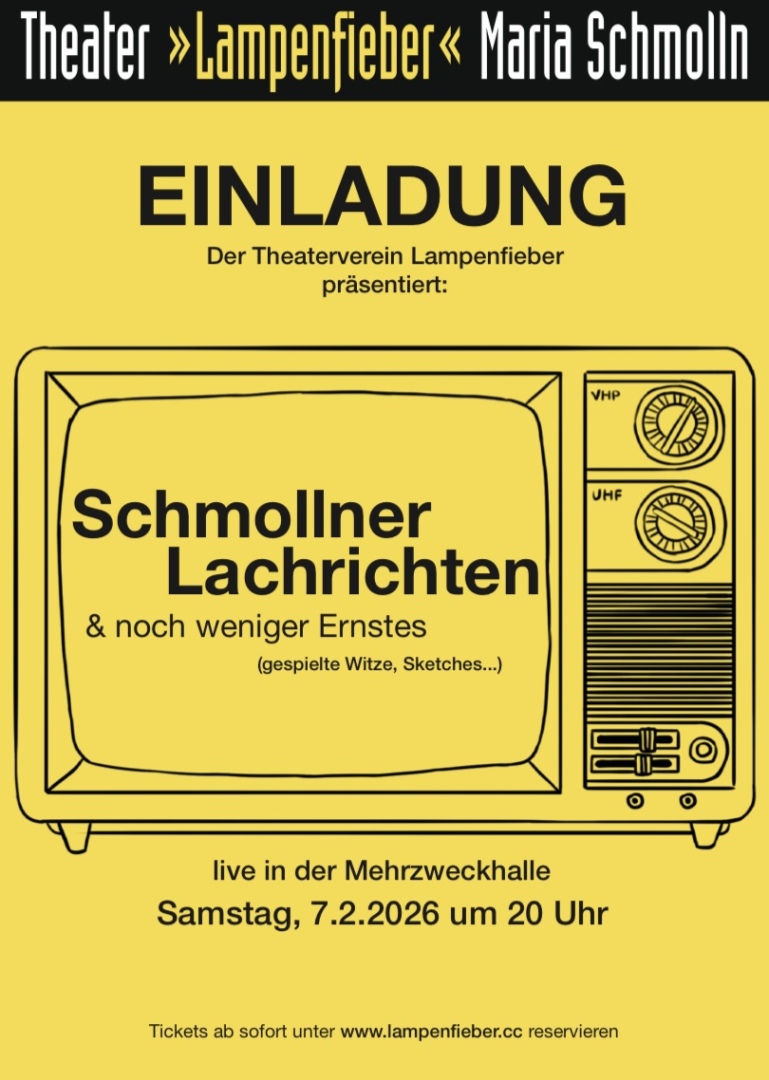 Das Theater Lampenfieber bringt die Lachrichten & noch weniger Ernstes auf die Bühne. Freut euch auf gespielte Witze, Sketches und einen satirischen Blick auf das Schmollner Leben! Gelacht wird bis spät nach Mitternacht. Kostümierung erwünscht!