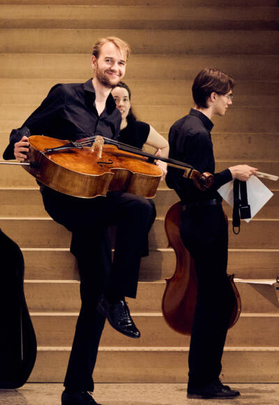 Studierende der Schlagwerkklasse Maximilian Näscher an der Stella Musikhochschule musizieren im Kleinen Saal der Stella.