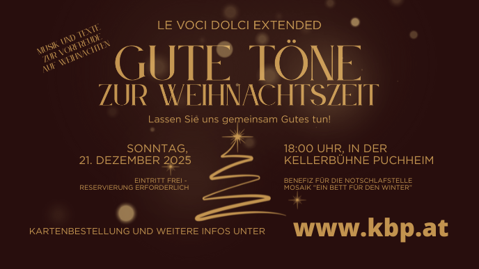 | Preisinformation | Der Erlös des Konzertes in Form von freiwilligen Spenden kommt einem wohltätigen Zweck („Ein Bett für den Winter“) zugute. Sichern Sie sich rechtzeitig ihre kostenlosen Plätze unter www.kbp.at! |