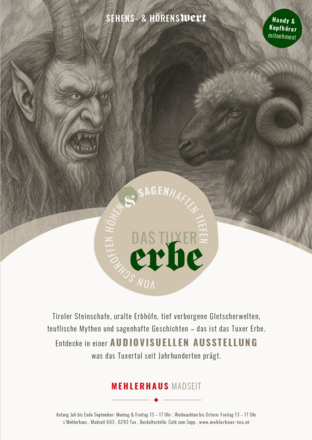 Mit viel Liebe zum Detail werden die Besucher auf eine Reise durch Sagen, Höhlen, Berge und mystische Gestalten mitgenommen. Aber sie erfahren auch mehr über die tierischen Bewohner der steilen Höhen – dem Tuxer Steinschaf – oder was es bedeutet, die Auszeichnung „Erbhof“ zu führen.
