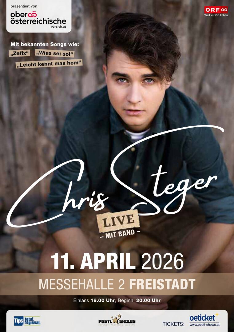 Das Konzerthighlight mit CHRIS STEGER und seiner mit Band in der Messehalle in Freistadt verspricht einen Abend voller Musik, Emotionen und unvergesslicher Momente zu werden. Sichern Sie sich jetzt Ihre Tickets und erleben Sie Chris Steger live bei seinem ersten exklusiven Konzert in Freistadt!