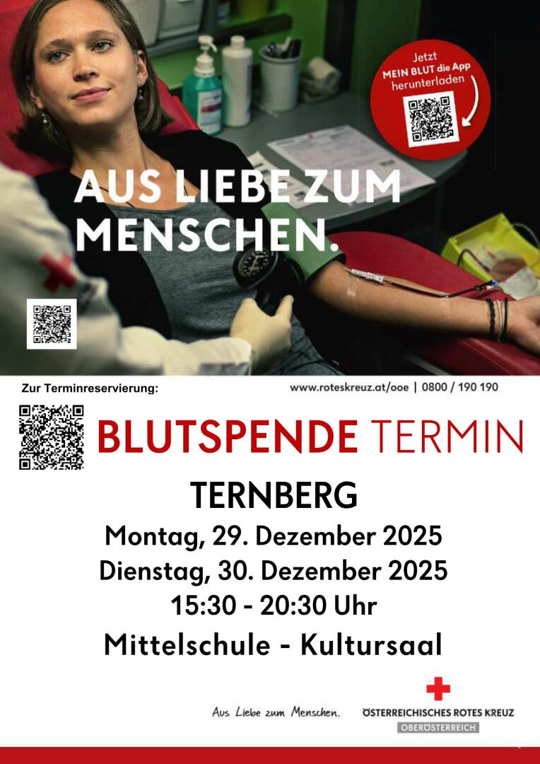 Die Marktgemeinde Ternberg und der Blutspendedienst vom Roten Kreuz OÖ laden Sie herzlich ein zur