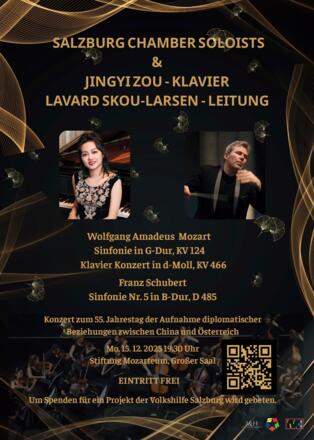 Das Konzert "In Verbundenheit" präsentiert die Salzburger Kammer-Solisten unter der Leitung von Lavard Skou-Larsen, mit der chinesischen Pianistin Jingyi Zou als Solistin. Die Veranstaltung findet im Großen Saal der Stiftung Mozarteum statt und umfasst Werke von Wolfgang Amadé Mozart und Franz Schubert. Anlässlich des 55-jährigen Jubiläums der diplomatischen Beziehungen zwischen China und Österreich wird die kulturelle Freundschaft durch musikalischen Austausch gefeiert. Der Eintritt ist frei, jedoch werden Spenden erbeten, die Kinderhilfsorganisationen in Salzburg zugutekommen.