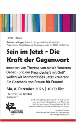 Der Einkehrtag beginnt mit dem Gottesdienst um 10.00 Uhr in der Pfarrkirche. Danach sind alle herzlich eingeladen ins Pfarrzentrum Großarl, für das leibliche Wohl ist gesorgt. Es wird zum Thema "Sein im Jetzt - Die Kraft der Gegenwart" mit Barbara Hettegger ein Raum der Verbindung, Ruhe und Sicherheit geschaffen.