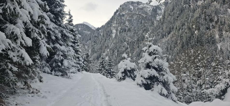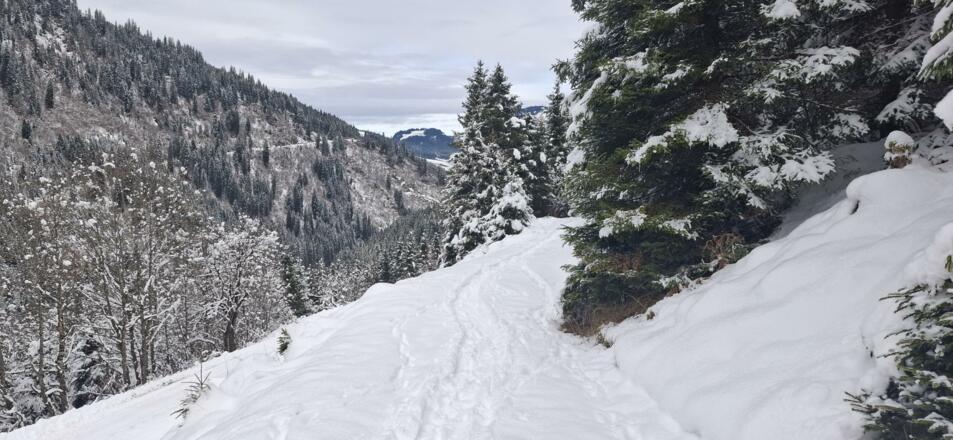 Nach dem Anlegen der Schneeschuhe wandern wir zum Speichersee, der bei Sonne türkis leuchtet. Auf einem Forstweg tauchen wir in den Lachwald ein und wandern durch den tiefverschneiten Winterwald stetig bergauf. Auf der Höhe vom Berghof suchen wir uns auf einer kleinen Bank einen Rastplatz, wo wir unseren selbstmitgebrachten warmen Tee und eine Jause genießen. Gestärkt machen wir uns auf einem Forstweg gemütlich auf den Rückweg.