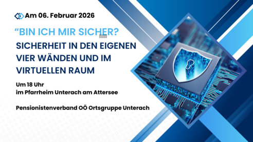 Der Pensionistenverband OÖ, Ortsgruppe Unterach, lädt zu der Informationsveranstaltung „Bin ich mir sicher?? Sicherheit in den eigenen vier Wänden und im virtuellen Raum“ ein. Im Pfarrsaal informiert Michael Eichinger von der Abteilung Kriminalprävention, Bezirkspolizeikommando Vöcklabruck, über aktuelle Sicherheitsrisiken im Alltag und im Internet. Der Vortrag gibt praxisnahe Tipps, wie man sich vor Einbruch, Betrug und digitalen Gefahren schützen kann, und bietet Raum für Fragen und Austausch.