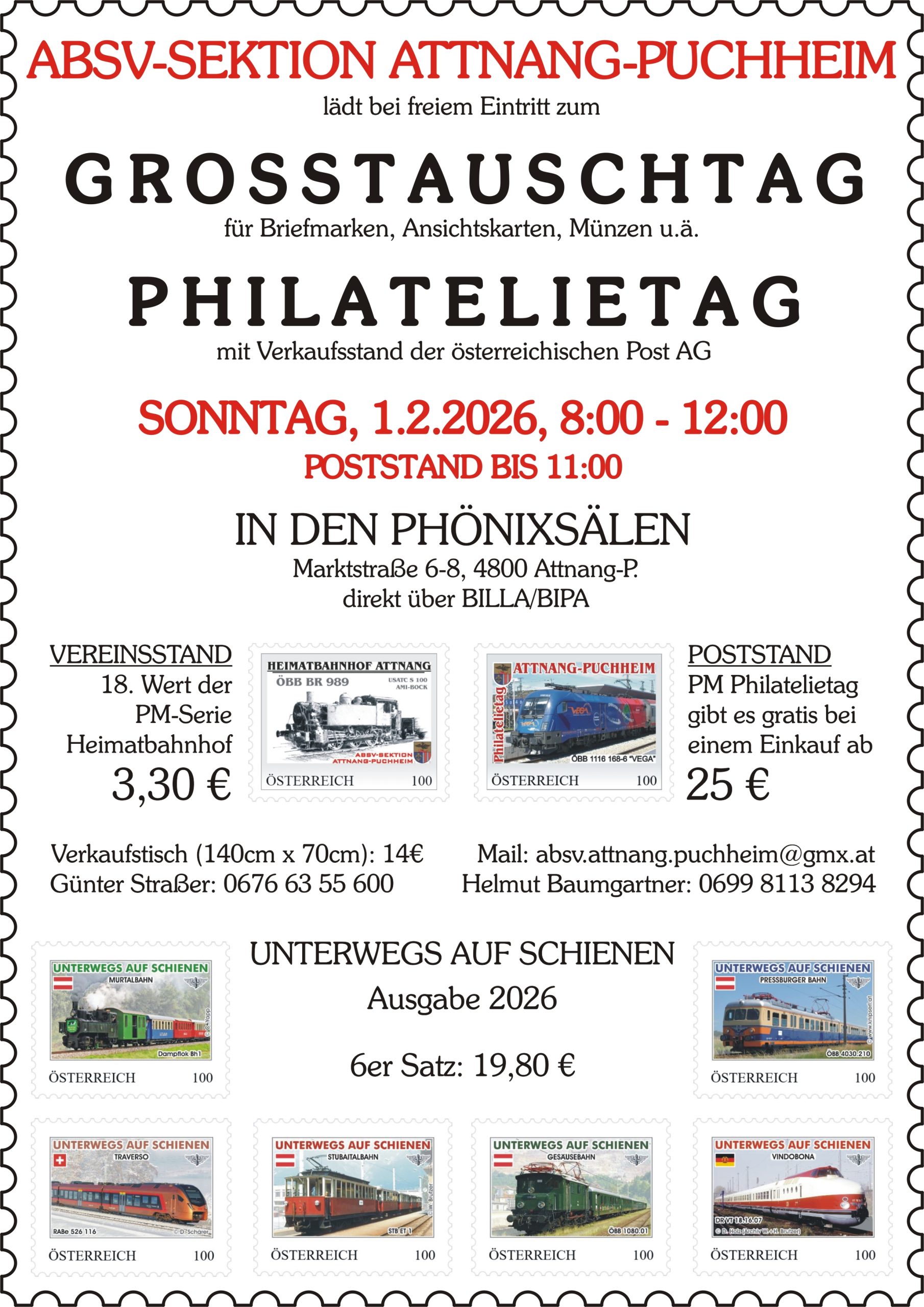 Weiters wird vom Verein ein neuer Wert der personalisierten Briefmarkenserie ,,Heimatbahnhof Attnang" verausgabt und bisherige Marken, Briefe und Sonderstempel zum Verkauf angeboten.