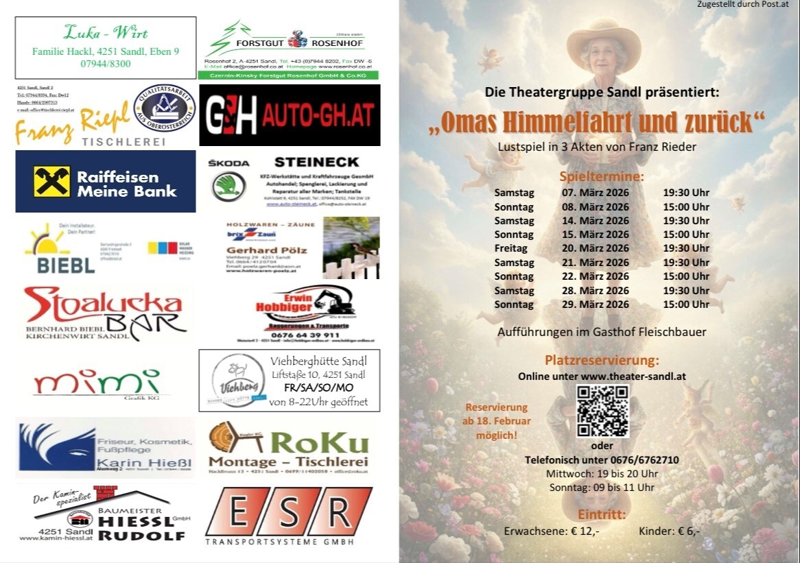 Auch im neuen Jahr 2026 dürfen wir Sie wieder herzlich nach Sandl zu unserem Lustspiel in 3 Akten von Franz Rieder einladen:
